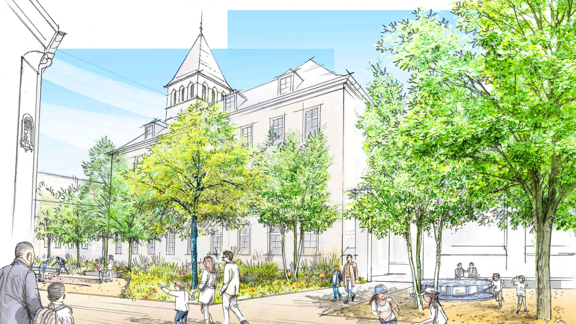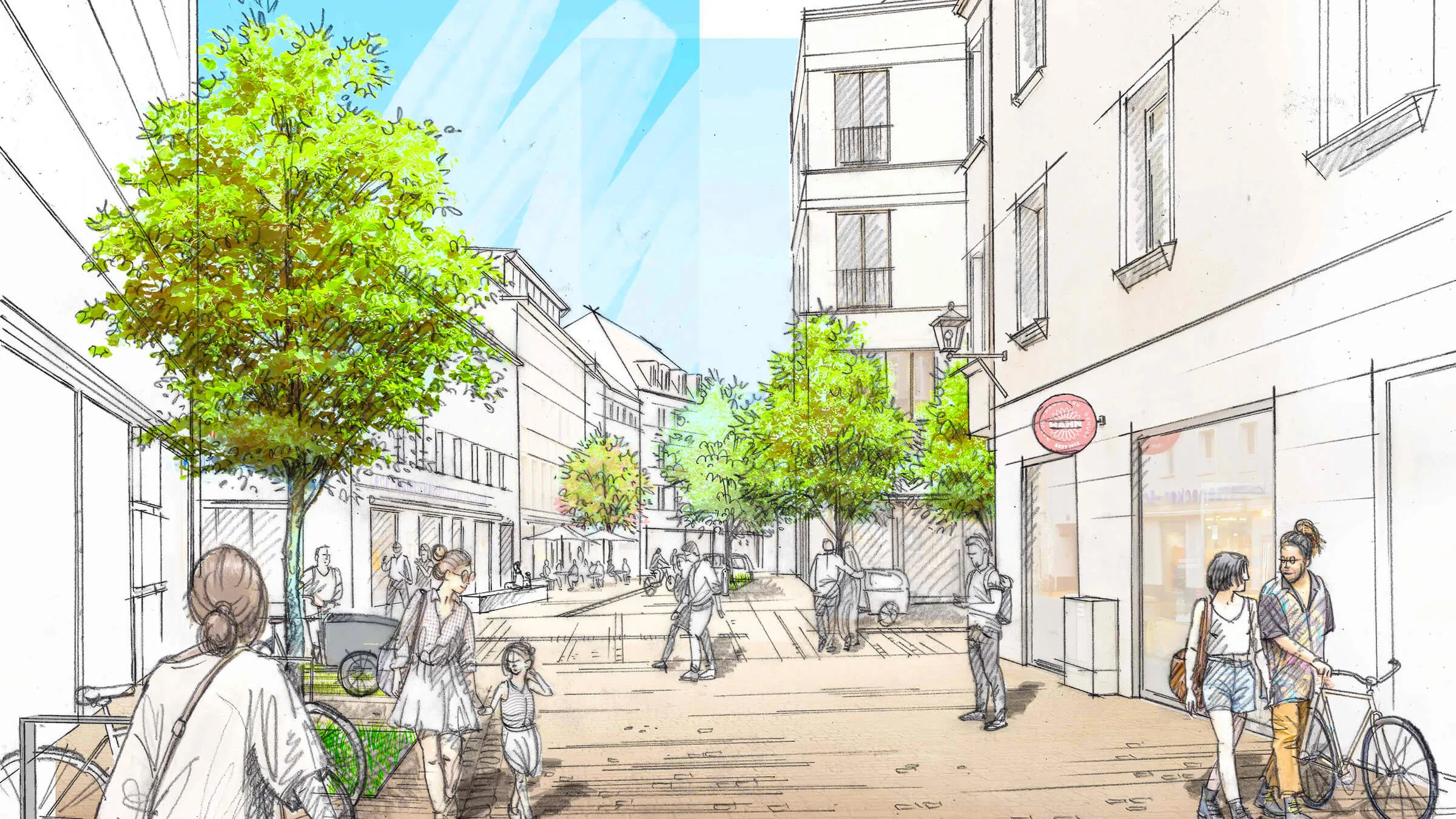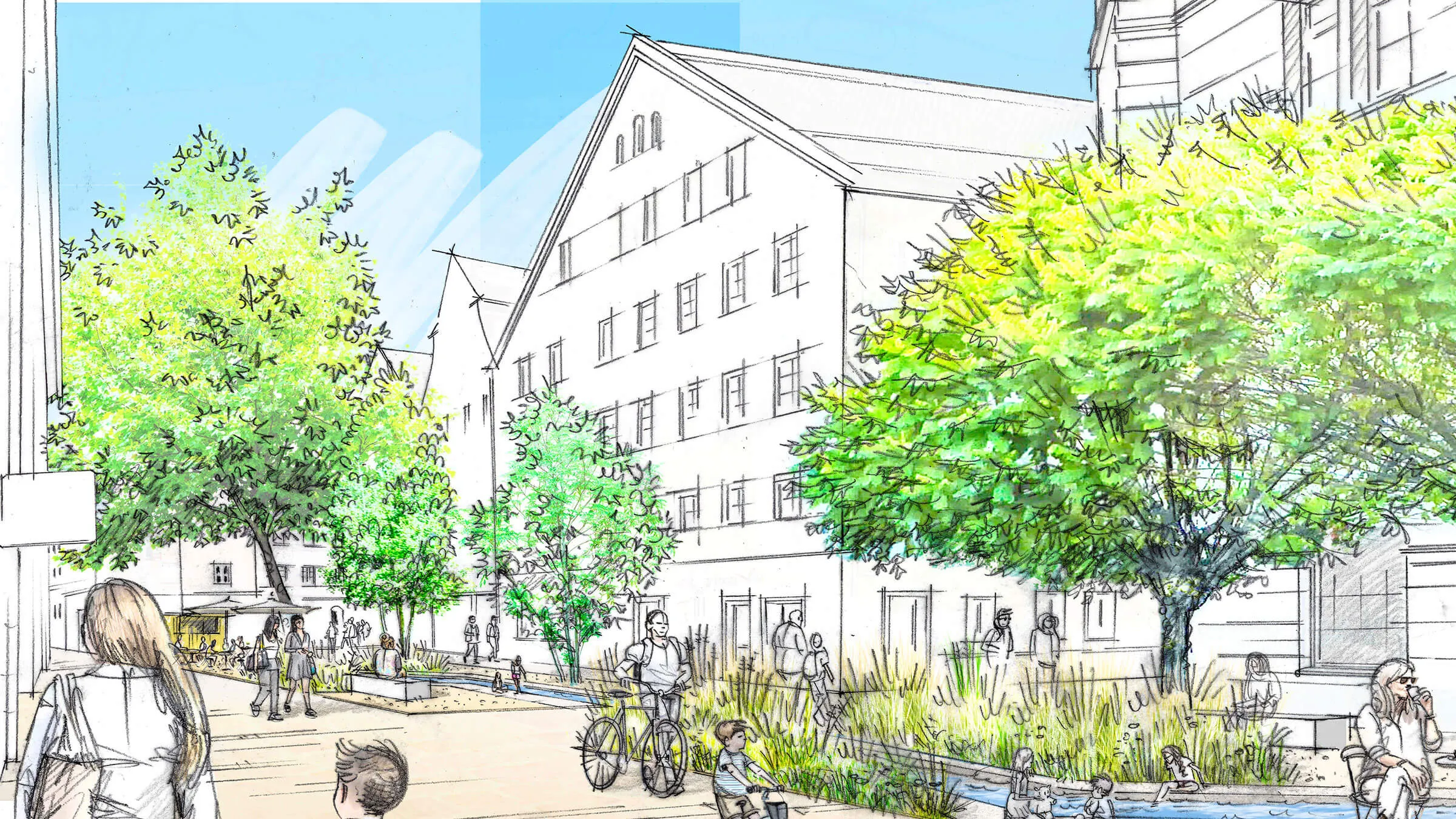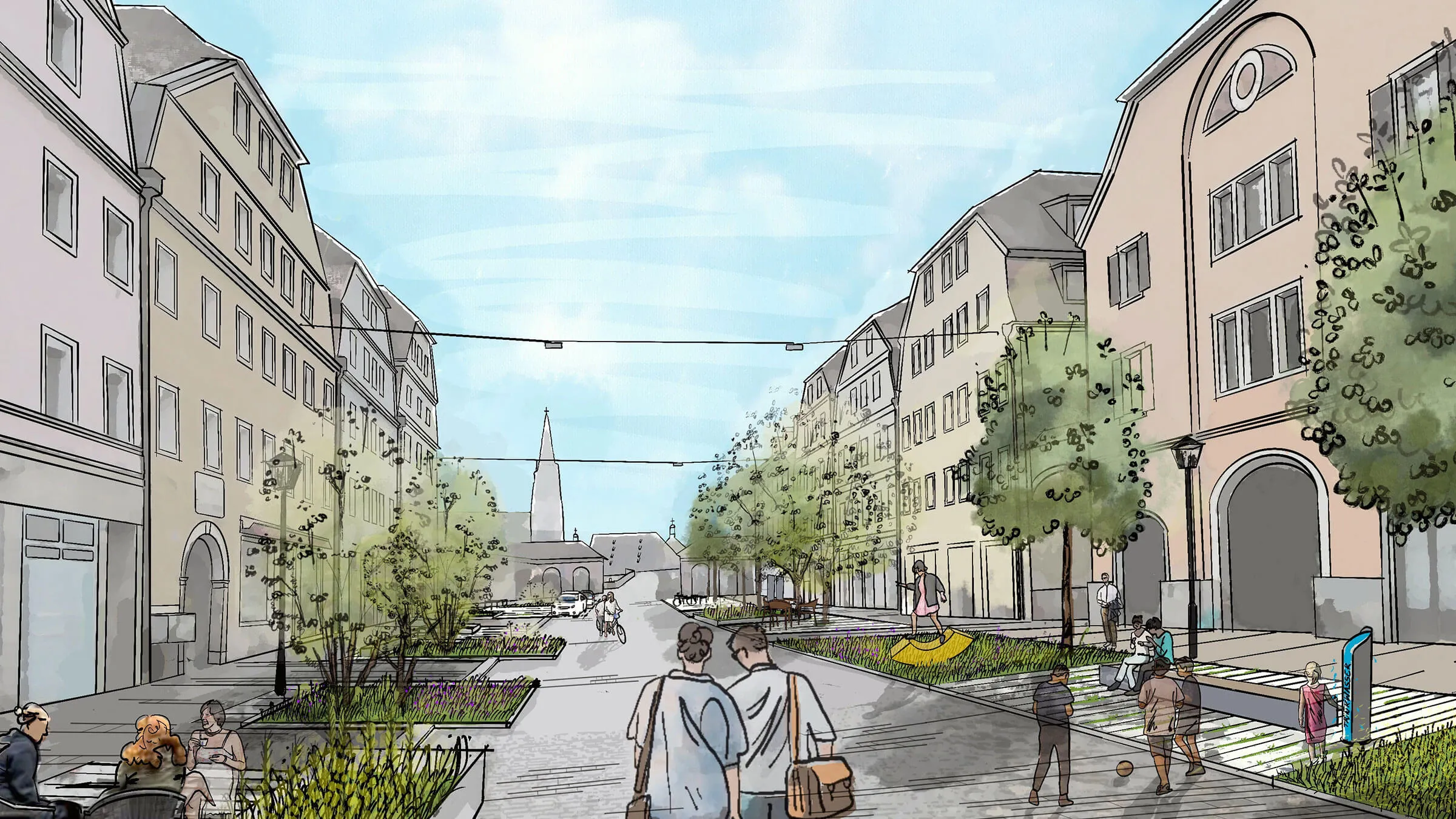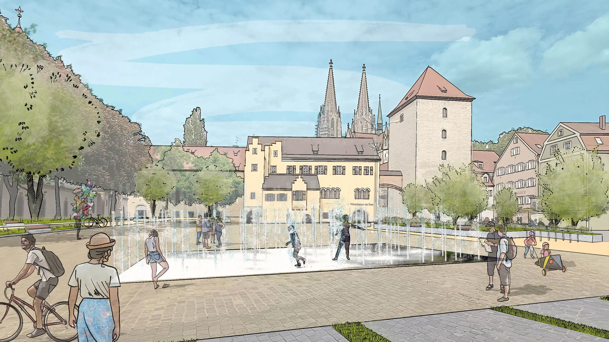 Ein Quartier mit Geschichte erwacht zu neuem Leben: Lange war dieser Raum vom Kfz-Verkehr dominiert – funktional, aber wenig einladend. Nun wird er zurückgewonnen: für Menschen, für das Klima, für mehr Miteinander. Das neue „Multifunktionsband" bietet Platz für Außengastronomie, Spielangebote und Grünflächen. Der neugestaltete Brunnenplatz mit Solitärbäumen am Obermünsterplatz sowie der neue Spielbach „Vitus" in der Obermünsterstraße schlagen eine Brücke zur Geschichte des Ortes – und wirken zugleich positiv auf das Stadtklima. Ein besonderes Augenmerk galt dem Bürgerdialog: Anwohner wurden aktiv beteiligt, ihre Ideen sind direkt in die Planung und Gestaltung eingeflossen. Ein Stadtteil im Wandel – mit Respekt für das Bestehende und Offenheit für das Neue.